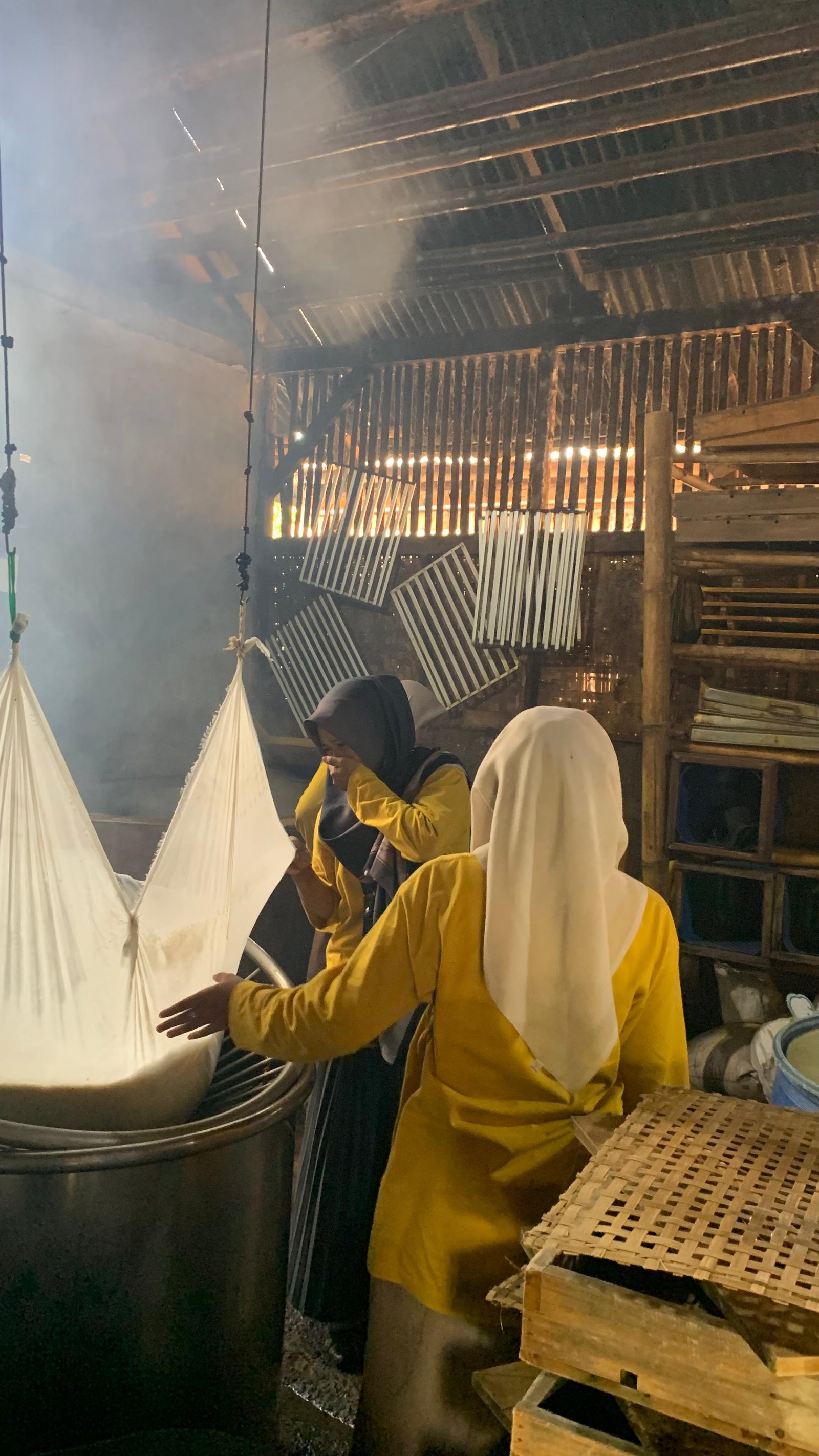 Dalam kunjungan tersebut, mahasiswa KKN mengikuti seluruh tahapan pembuatan tahu kuning, mulai dari pemilihan bahan baku kedelai, proses perendaman, penggilingan, pemasakan, penyaringan, pengendapan, hingga pencetakan tahu. Proses yang terlihat sederhana ini ternyata membutuhkan ketelitian, ketekunan, serta pengalaman agar menghasilkan tahu berkualitas baik dan layak konsumsi.