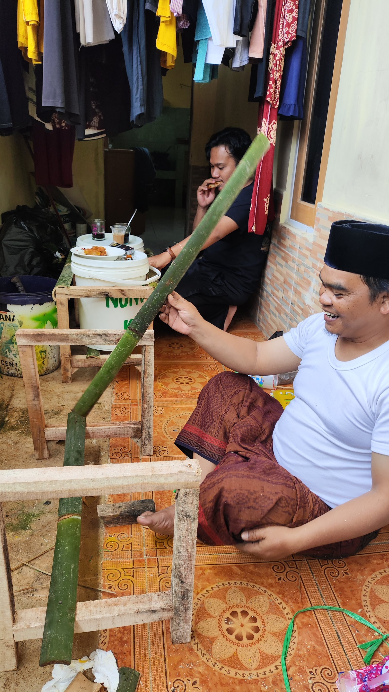 Sementara itu, di sisi lain, tampak anggota kelompok lainnya tengah sibuk mengerjakan program kerja (proker) dengan penuh fokus. Ia terlihat memegang batang bambu yang sedang diproses, menandakan adanya persiapan atau pembuatan sarana untuk menunjang kegiatan kelompok. Keseriusan dalam bekerja itu menjadi simbol dedikasi dan tanggung jawab terhadap tugas yang telah disepakati bersama.